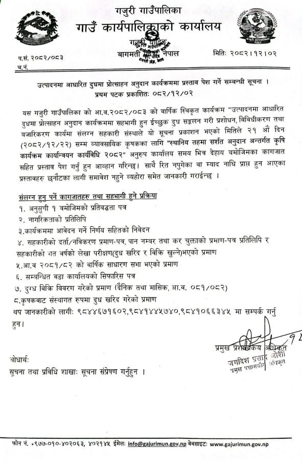 उत्पादनमा आधारित दुधमा प्रोत्साहन अनुदान कार्यक्रममा प्रस्ताव पेश गर्ने सम्बन्धी सूचना ।