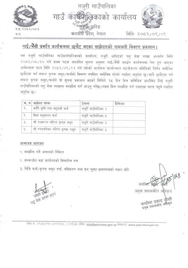 गाई/भैंसी प्रवर्द्धन कार्यक्रममा छनौट भएका साझेदारको नामावली विवरण प्रकाशन सम्बन्धी सूचना ।