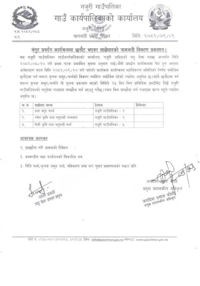 बंगुर प्रवर्द्धन कार्यक्रममा छनौट भएका साझेदारको नामावली विवरण प्रकाशन सम्बन्धी सूचना ।
