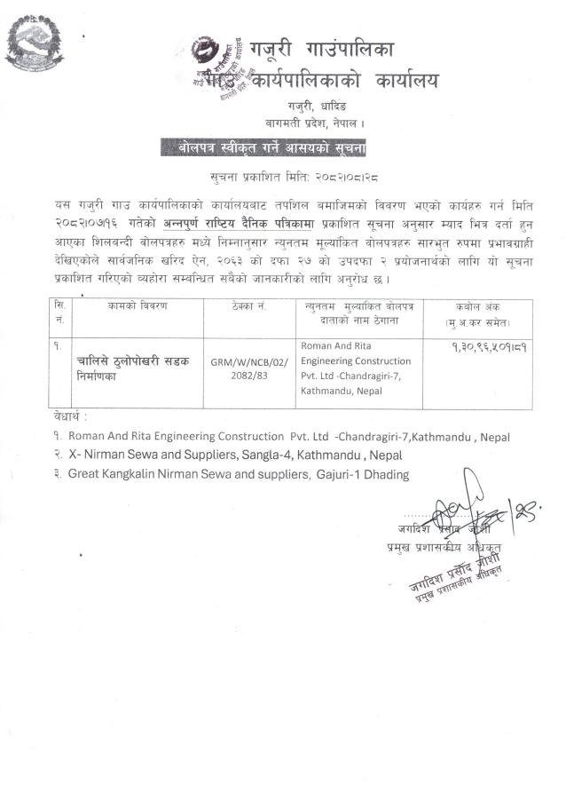 बोलपत्र स्वीकृत गर्ने आसयको सूचना : चालिसे ठुलोपोखरी सडक निर्माण