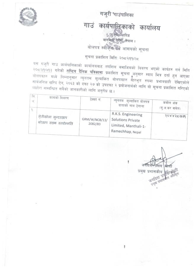 बोलपत्र स्वीकृत गर्ने आसयको सूचना ।