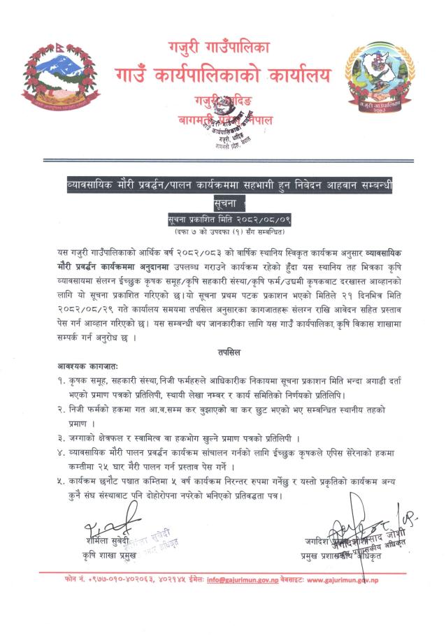 व्यावसायिक मौरी प्रवर्द्धन/पालन कार्यक्रममा सहभागी हुन निवेदन आव्हान सम्बन्धी सूचना । सूचना प्रकाशित मिति: २०८२/०८/०९