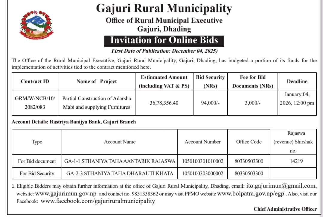 प्रस्ताव आव्हानको सूचना । प्रथम पटक सूचना प्रकाशन मिति: २०८२/०८/१०