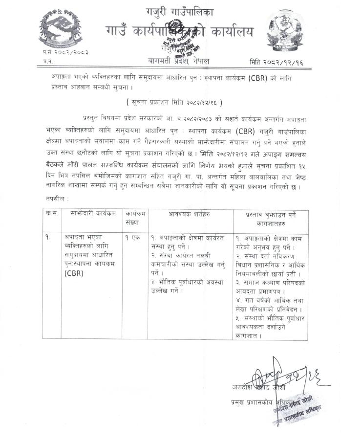 अपाङ्गता भएको व्यक्तिहरूका लागि समुदायमा आधारित पुन: स्थापना कार्यक्रम (CBR) को लागि प्रस्ताव आह्वान सम्बन्धी सूचना ।