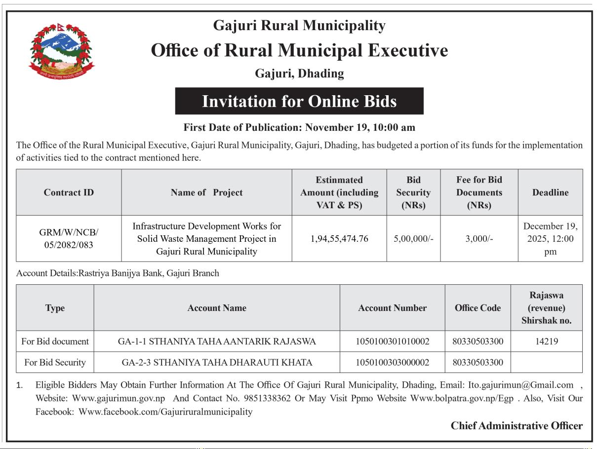 गजुरी गाउँपालिकामा फोहोरमैला व्यवस्थापनको लागि पूर्वाधार निर्माण कार्यको बोलपत्र आव्हान सम्बन्धी सूचना। प्रथम पटक प्रकाशित मिति: २०८२/०८/०३ गते ।