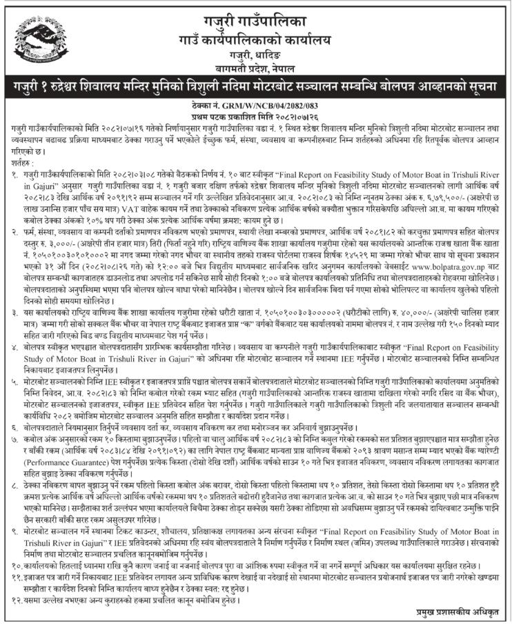 गजुरी १ रुद्रेश्‍वर शिवालय मन्दिर मुनिको त्रिशुली नदिमा मोटरबोट सञ्‍चालन सम्बन्धी बोलपत्र आव्हानको सूचना। प्रथम पटक प्रकाशित मिति: २०८२/०७/२६