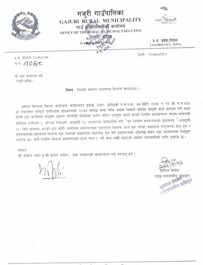 निर्माण सम्पन्न प्रमाणपत्र वितरण सम्बन्धमा