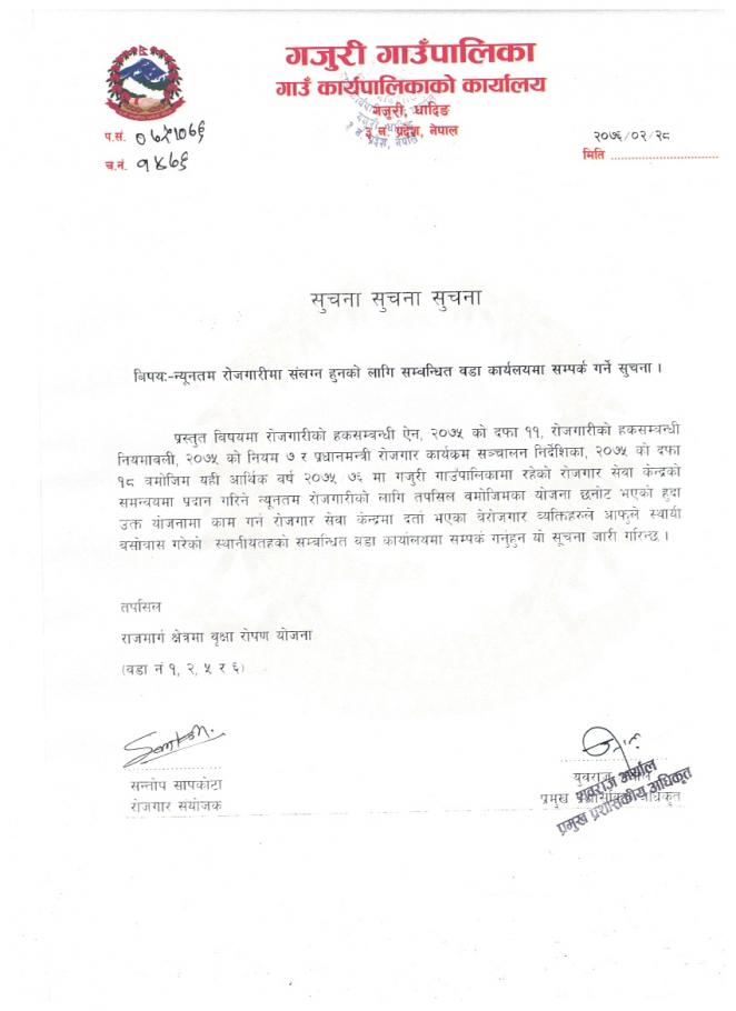 न्युनतम राेजगारीमा संलग्न हुनकाे लागि सम्बन्धित वडा कार्यलयमा सम्पर्क गर्ने सूचना