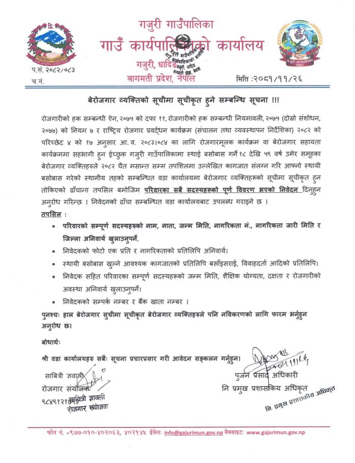 बेरोजगार व्यक्तिको सूचीमा सूचीकृत हुने सम्बन्धी सूचना ।