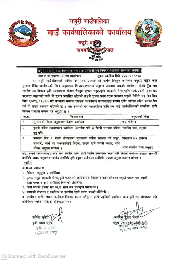 » राष्ट्रिय फल सुन्तला विशेष कार्यक्रममा सहभागी हुन निवेदन आह्वान सम्बन्धी सूचना ।