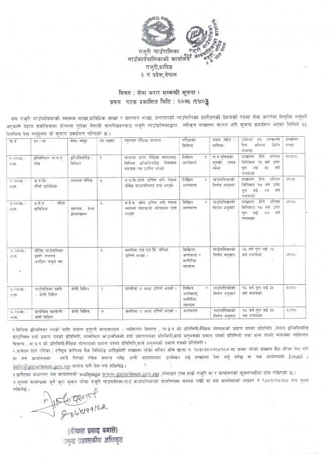 यस गजुरी गाउँपालिकाको स्वास्थ्य शाखा,प्राविधिक शाखा र प्रशासन शाखा अन्तर्गतको गाउँपालिका प्रहरीहरुको देहायको पदमा सेवा करारमा नियुक्ति गर्नुपर्ने भएकोले देहाय बमोजिमका योग्यता पुगेका नेपाली नागरीकहरुबाट गजुरी गाउँपालिकाद्धारा स्वीकृत दरखास्त फारम भरी सूचना प्रकाशित भएको मितिले १५ दिनभित्र पेश गर्नुहुनस यो सूचना प्रकाशित गरिएको छ ।