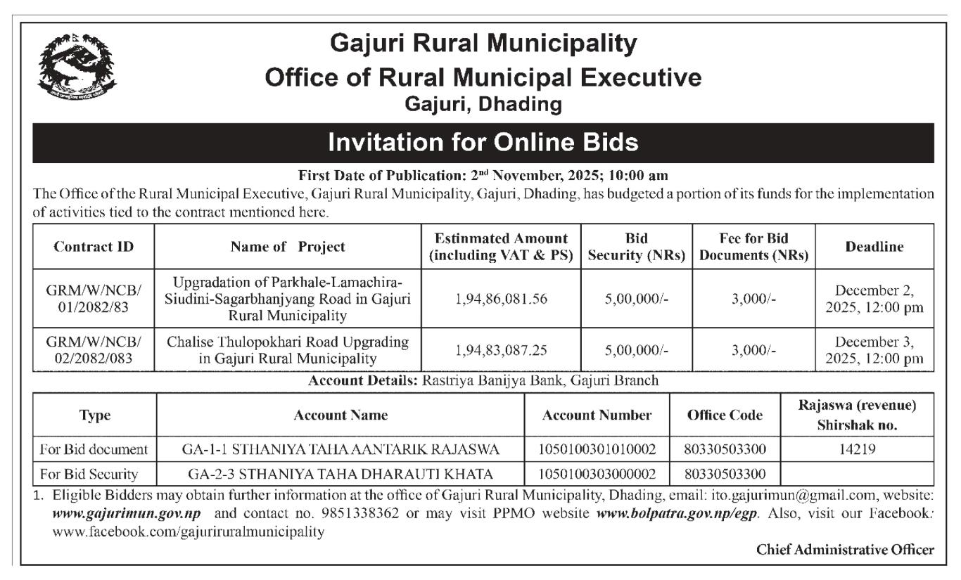 Invitation for Online Bids. First date of Publication on Annapurna Post Daily: 2nd November, 2025
