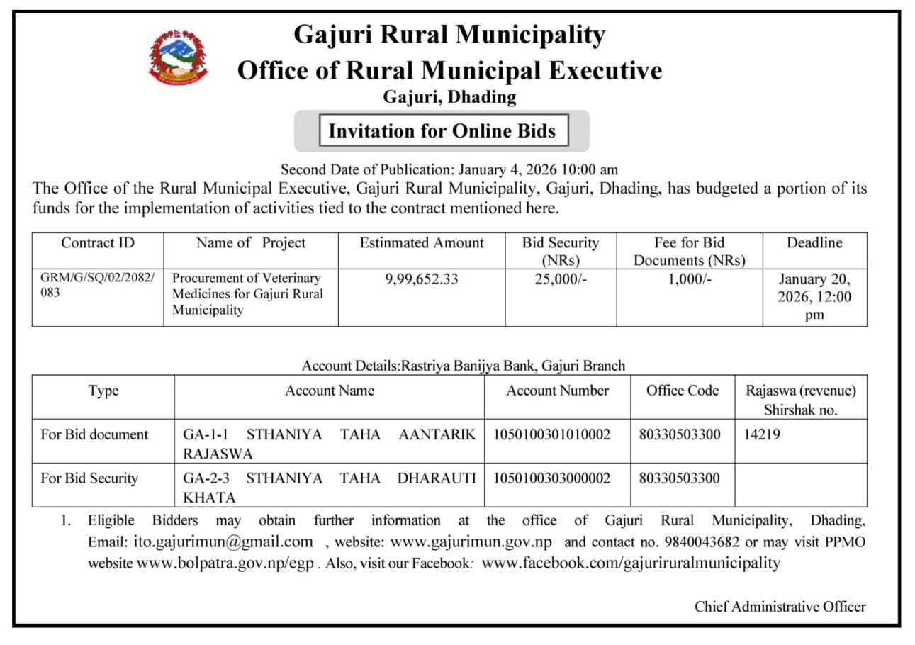» Invitation for Sealed Quotation: Procurement of Veterinary Medicines for Gajuri Rural Municipality.